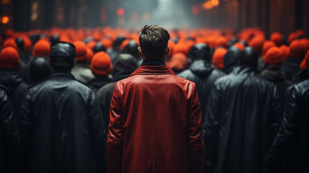 One red man standing with other people, unique person in the crowd. Generative AI