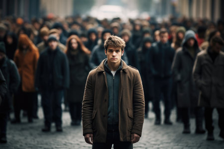 A man stands confidently in front of a large crowd of people at a public event, Young man on crowded street in movement standing out Concept of uniqueness, AI Generated
