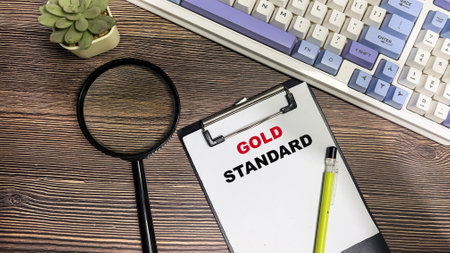 Concept of Gold Standard write on paperwork isolated on Wooden Table.
