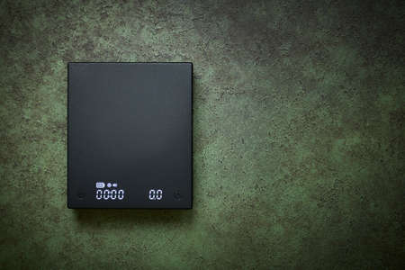 High precision professional digital portable scales with LCD display close up, barista tool, green background with copy space