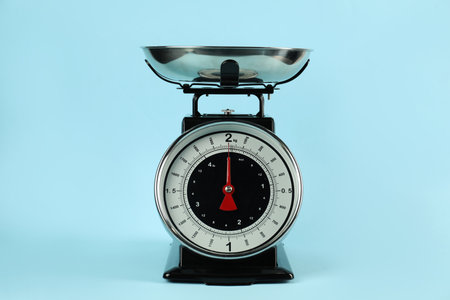 One mechanical kitchen scale on light blue background