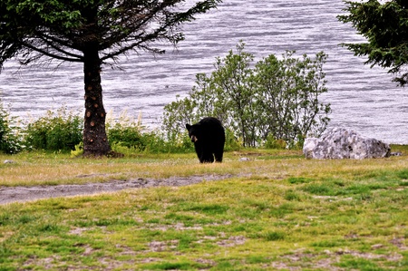 Black bear roaming low tide shores, looking for crabs. Vancouver Island, Canada