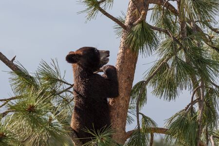 A brave little black bear climbing up a small pine tree looking for adventure on a sunny afternoon.