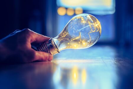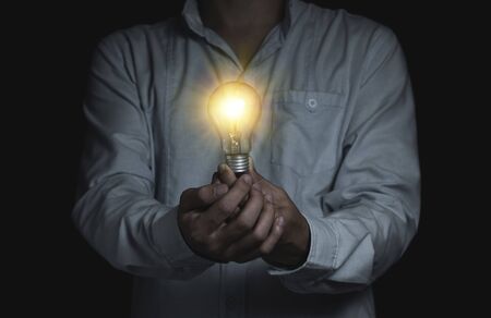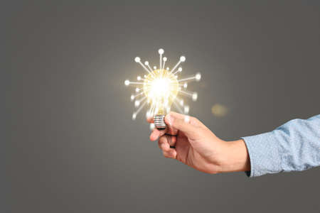 Hand of holding illuminated light bulb, idea, innovation inspiration concept
