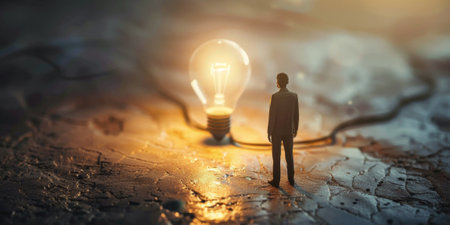 Businessman looking at glowing light bulb on cracked ground