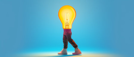 Light bulb and a person walking on a bright colorful background. Concept of original thinking. Generative AI