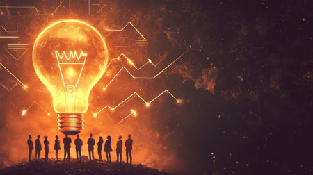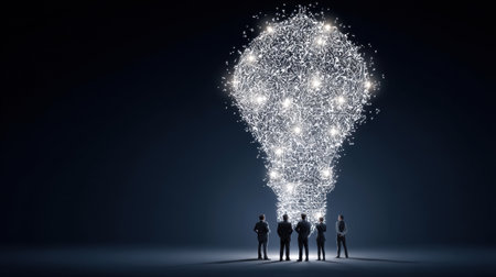 Innovative ideas emerge as glowing light bulb made of intricate designs illuminates dark space, symbolizing creativity and inspiration among group of professionals