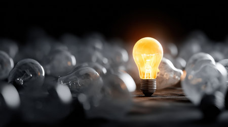 A solitary glowing filament casts a comforting amber hue amid dormant bulbs on a dark backdrop, embodying innovation and the spark of originality in creative spaces.