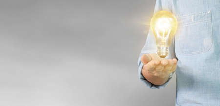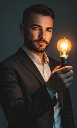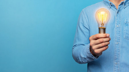 A man holds a glowing light bulb, representing new ideas and inspiration. The image is perfect for business and innovation concepts.