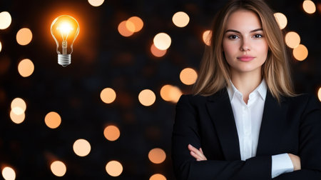 A confident young businesswoman stands with her arms crossed, exuding professionalism and a thoughtful demeanor, symbolizing a bright idea or innovative concept.