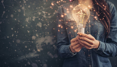 Hands holding a glowing light bulb, symbolizing creativity, innovation, and energy. Close-up, warm tones, and concept of bright ideas in focus.