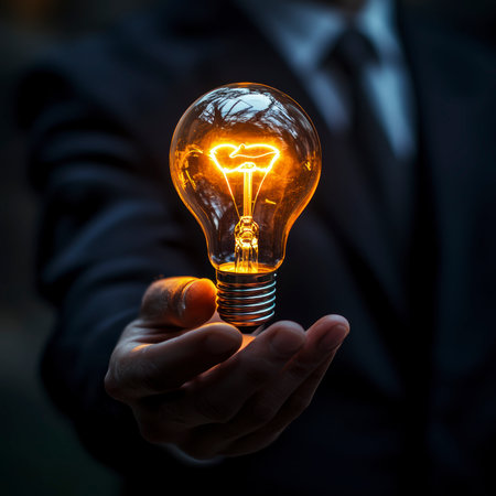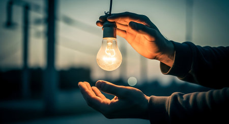 A glowing light bulb held by a hand, illuminated against a beautiful bokeh background with warm orange and blue hues, evoking inspiration and creativity.