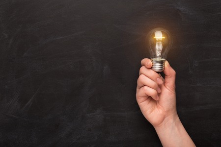 Hand holding a glowing lightbulb in front of a blackboard