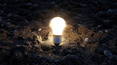 A single illuminated light bulb stands on dark soil, casting a warm glow in a tranquil night setting, blending creativity and nature beautifully.