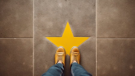Selfie of male feet in yellow shoes standing on the top of a yellow star on the stairs