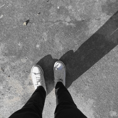 Pair of legs and shoes on asphalt ground, high angle footsie or flortrait, personal pespective from above.