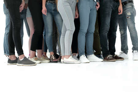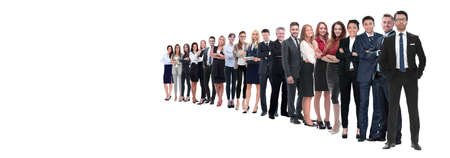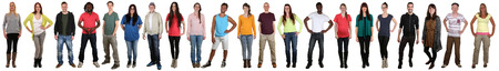 Smiling happy multicultural multi ethnic group of young people standing in a row isolated on a white background