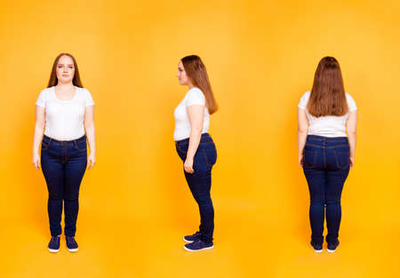 Collage of three full length portraits from all side of confident, stylish, plump woman in casual outfit, wearing t-shirt, jeans, sneakers, standing over yellow background