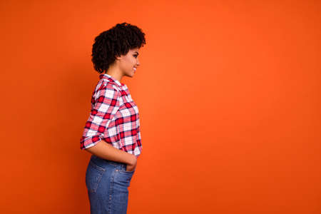 Profile side photo of lovely pretty lady look empty space hold hands pockets listen friend isolated shine color background
