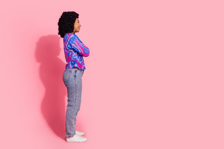 Photo of positive nice cute woman wear print clothes look empty space banner isolated on pink color background