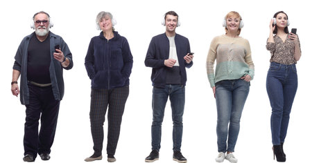 Doing their own thing on their devices. Studio shot of people waiting in line against a grey background.