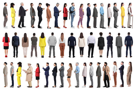 Rear View Of People With Different Occupations Standing In Row Against White Background