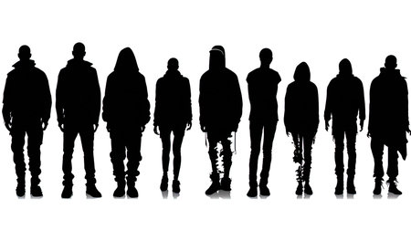 Portrait in profile of group of modern bearded men standing in a row. Isolated over white.
