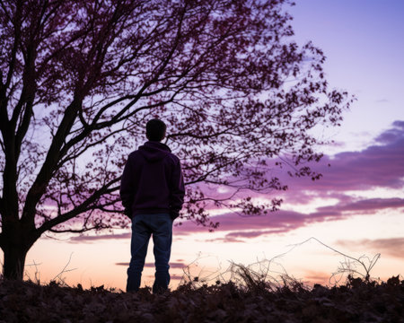 a man standing in front of a tree at sunset