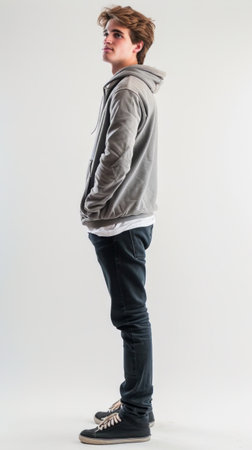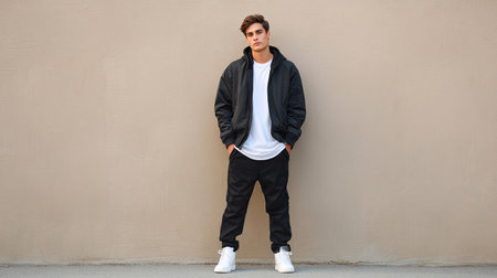 A young man stands confidently in a casual outfit against a plain background, embodying the essence of modern streetwear and laid-back fashion trends.
