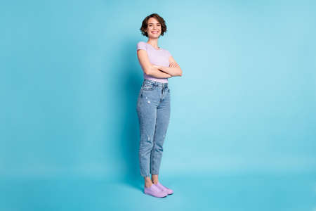 Full length turned photo of pretty charming friendly worker girl cross hands enjoy work decide decision wear good look mood outfit isolated blue color background
