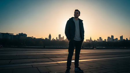 A contemplative figure in a hooded jacket gazes at the fiery horizon, with the city's gentle blur amplifying a serene, introspective atmosphere.