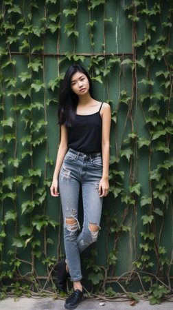 photo of beautiful asian woman in black top and jeans in fishing village, generative AI