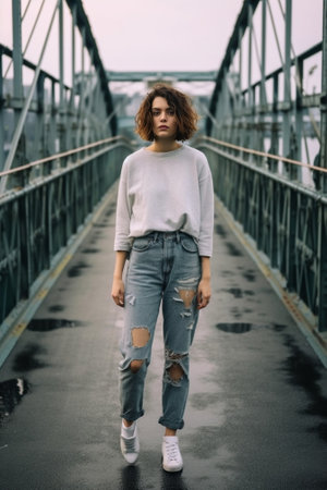 young pretty woman standing on the riverside bridge in the city : Generative AI