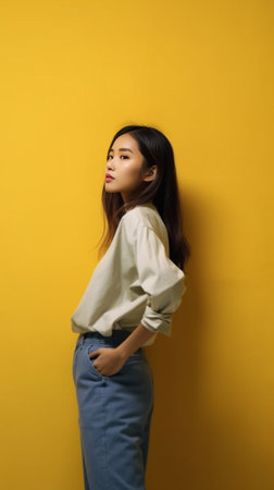 Vertical shot of dreamy thoughtful young Asian woman with dark hair focused above considers something wears casual yellow jumper isolated over white background copy space : Generative AI