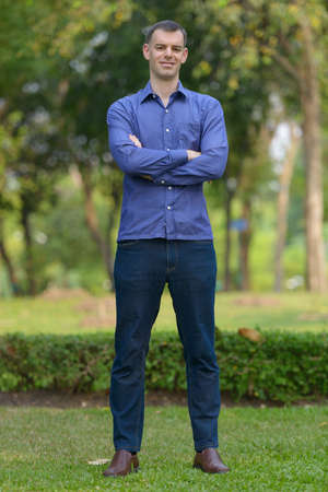 Portrait of happy businessman relaxing at the park