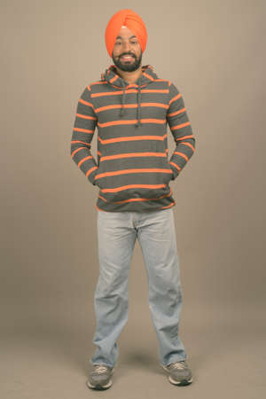 Young handsome Indian Sikh man wearing turban against gray background