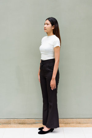 Portrait of young Asian woman standing wearing business clothes against plain wall outdoors