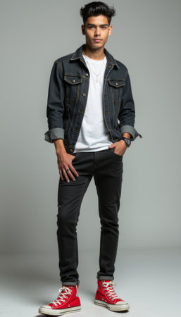 A fashionable young man stands tall, exuding confidence in a trendy outfit featuring a denim jacket and red sneakers. His casual yet chic look is perfect for urban settings, showcasing a blend of modern style and youthful energy.