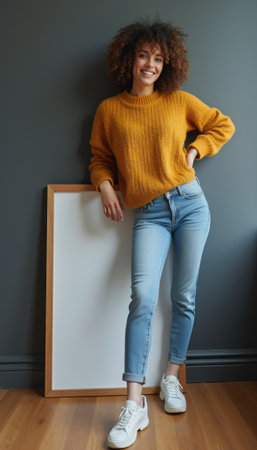 Smiling woman in a cozy sweater poses confidently beside a blank frame