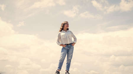 Street style. Wearing accessible pieces. Fashion girl. Stylish sexy girl outdoors sky background. Daily outfit. Developing own style. Forgoing designer labels does not have to mean sacrificing style
