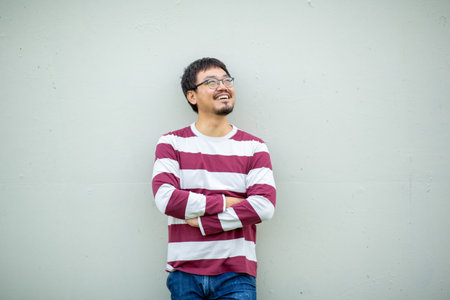 Asian mature man with a beard, glasses, and short hair wearing a striped t-shirt and jeans, standing outdoors with folded arms and looking up while smiling