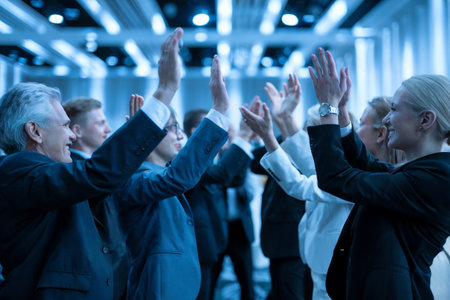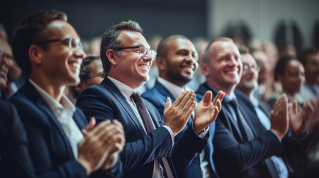 Business people applauding, showing appreciation and celebrating success during a corporate event, conference, or team meeting in an office environment