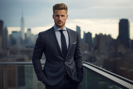 young businessman standing confidently in a modern office, wearing a stylish suit, with cityscape in the background