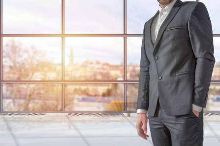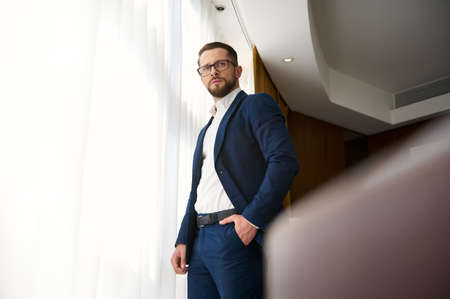 Handsome successful businessman, prosperous business investor, young entrepreneur in business suit and eyeglasses during a business trip, stands with hands in pocket at the window in a hotel room