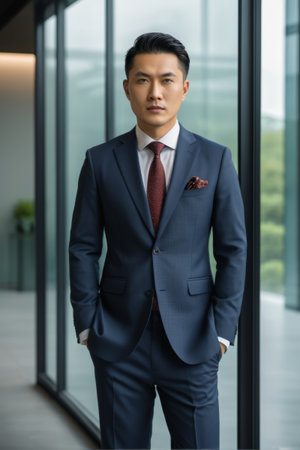A sophisticated businessman stands confidently in a tailored suit beside a large window. This striking image captures the essence of modern professionalism and ambition.