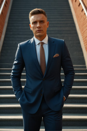Man in a tailored suit looks up, exuding confidence and ambition.