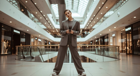 Business professional stands confidently in modern office corridor during busy workday in city center