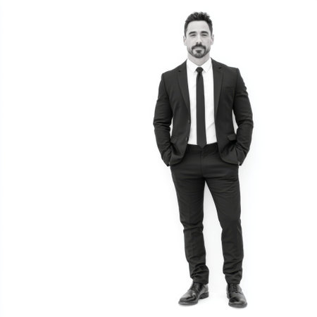 A professional male figure stands confidently in a tailored suit and tie, capturing a sense of modern elegance in monochrome photography.