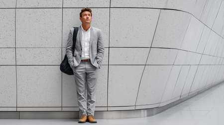 A confident businessman stands outdoors, showcasing his professional attire and groomed appearance. The modern architectural background enhances the sophisticated vibe.