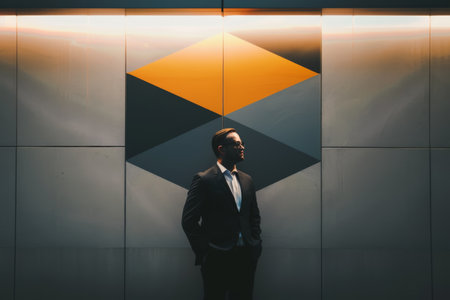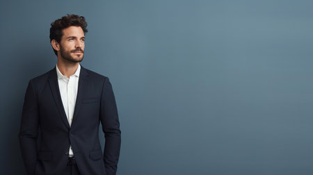 A stylish businessman in a dark suit, standing confidently with his hands in his pockets in a minimalist office space